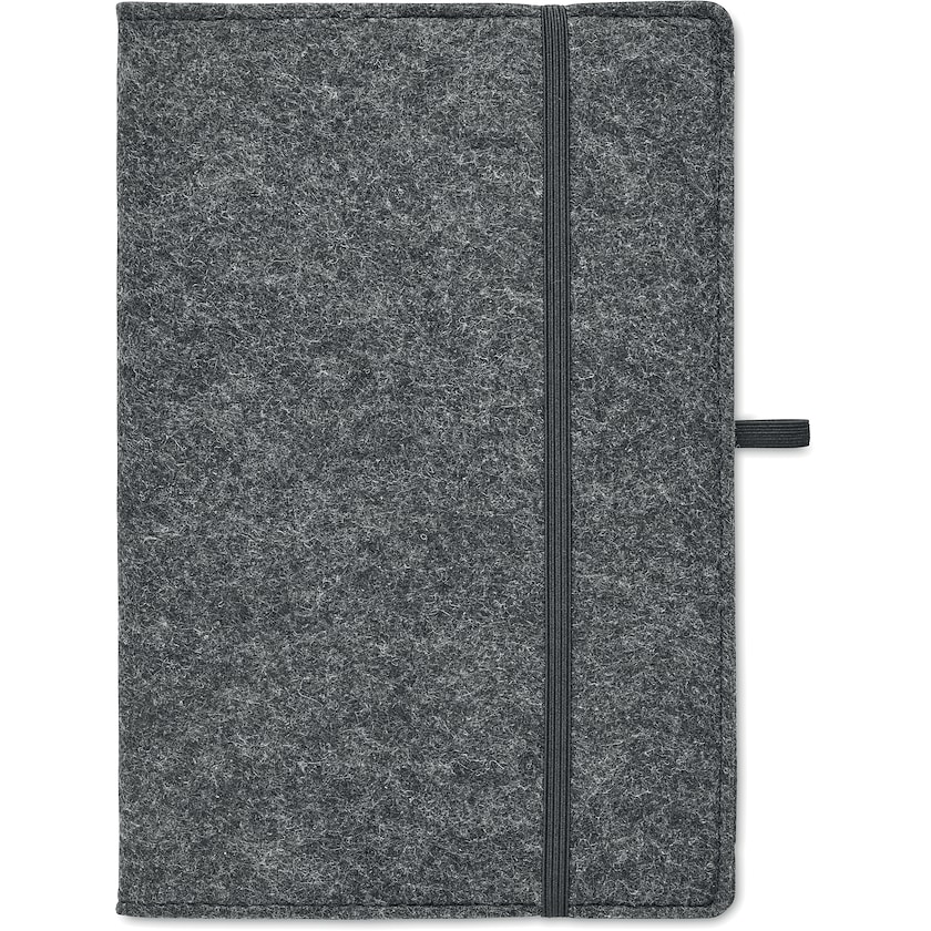 Notizbuch mit Umschlag aus recyceltem Filz. Der Einband besteht aus 80 linierten Blättern aus Recyclingpapier. Der Einband ist aus rPET, d.h. aus recycelten PET-Flaschen, hergestellt.