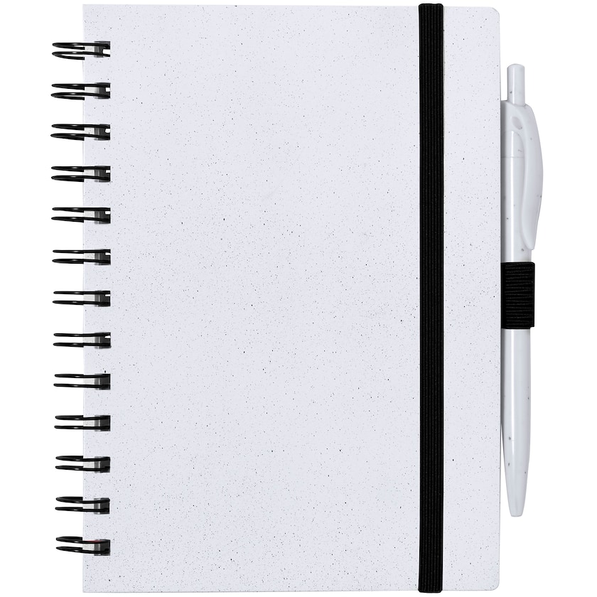 Spiralförmiges Notizbuch aus recyceltem Material. Der Einband besteht aus recyceltem ABS und die Einlage aus 70 linierten Blättern Recyclingpapier. Der Stift besteht ebenfalls aus recyceltem ABS. Eine umweltfreundliche Wahl.