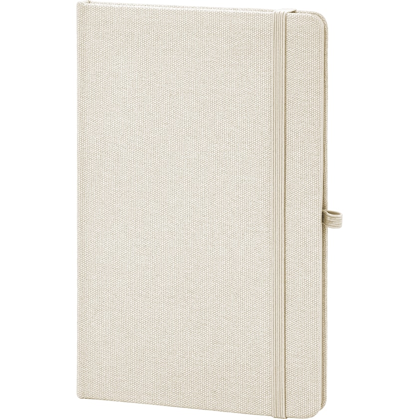 Notizbuch im Format A5 aus recycelten Materialien. Der Einband ist aus recycelter Baumwolle und das Innere besteht aus 80 linierten Blättern aus recyceltem Papier. Das Notizbuch ist mit einem Gummiband, Lesezeichen und Stifthalter ausgestattet.