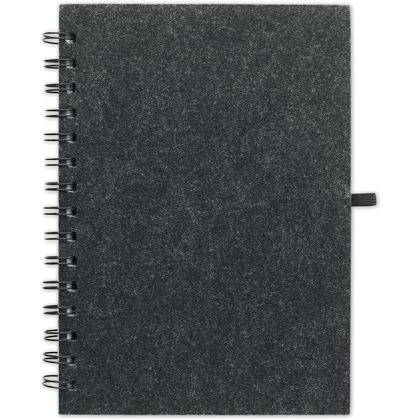 Umweltfreundliches Spiralbuch mit Filzhülle. Die Filzhülle besteht aus rPET, also recycelten PET-Flaschen, und die Einlage aus Recyclingpapier. Auf der Rückseite des Covers befindet sich ein Symbol, das darauf hinweist, dass es sich um recyceltes Material handelt.