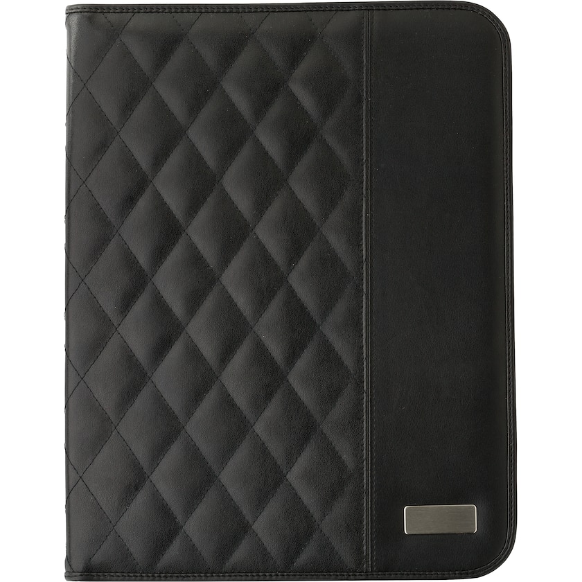 Luxuriöse Konferenzmappe mit Kunstledereinband. Im Inneren befinden sich ein Schreibblock mit 25 linierten Seiten sowie mehrere Taschen und Stifthalter. Die Kennzeichnung erfolgt mittels Lasergravur auf der Metallplatte auf der Vorderseite der Tagungsmappe.