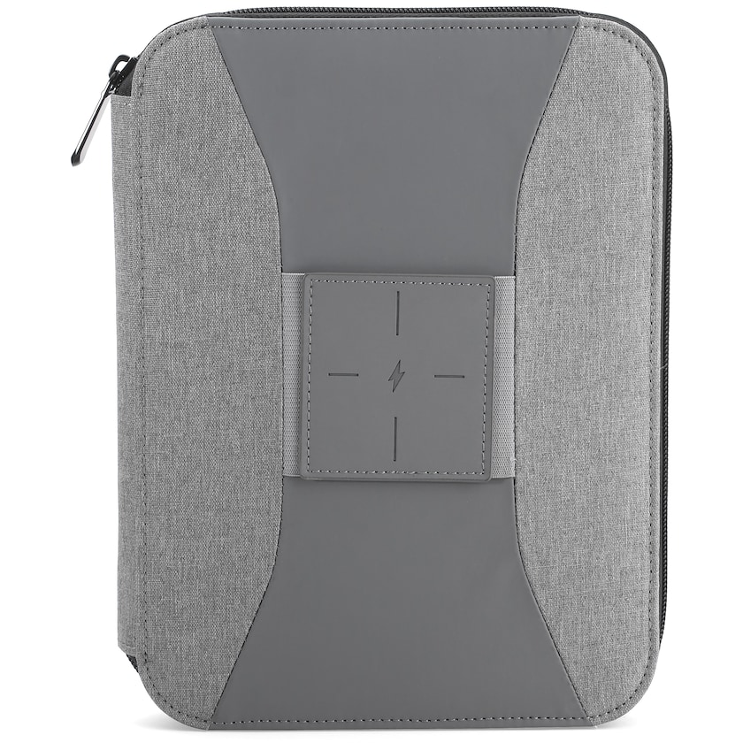 Konferenzmappe mit integrierter 5000-mAh-Powerbank. Im Inneren gibt es einen Notizblock, Visitenkartenfächer und einen Stifthalter. Die Aufladung kann sowohl kabellos erfolgen, indem das Handy auf die Konferenzmappe gelegt wird, als auch per Kabel.