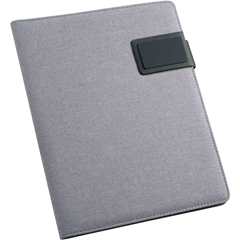 Konferenzmappe in A4-Größe mit Umschlag aus Stoff und Kunstleder. Die Mappe wird mit Hilfe eines Magneten verschlossen. Innen befindet sich ein Schreibblock mit 20 linierten Blatt. Die Lasergravur erfolgt auf einer Metallplatte auf der Vorderseite der Konferenzmappe. Stift und anderes Zubehör wird nicht geliefert.