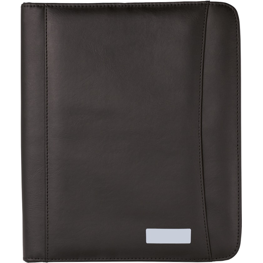Konferenzmappe aus Kunstleder im A5-Format. Im Inneren befindet sich eine Halterung für ein iPad (oder ein 9,7-Zoll-Tablet eines anderen Herstellers). Ein linierter Schreibblock mit 20 linierten Blättern ist im Lieferumfang enthalten. Die Markierung erfolgt durch Lasergravur auf der Metallplatte. Die Lasergravur erscheint in Schwarz.