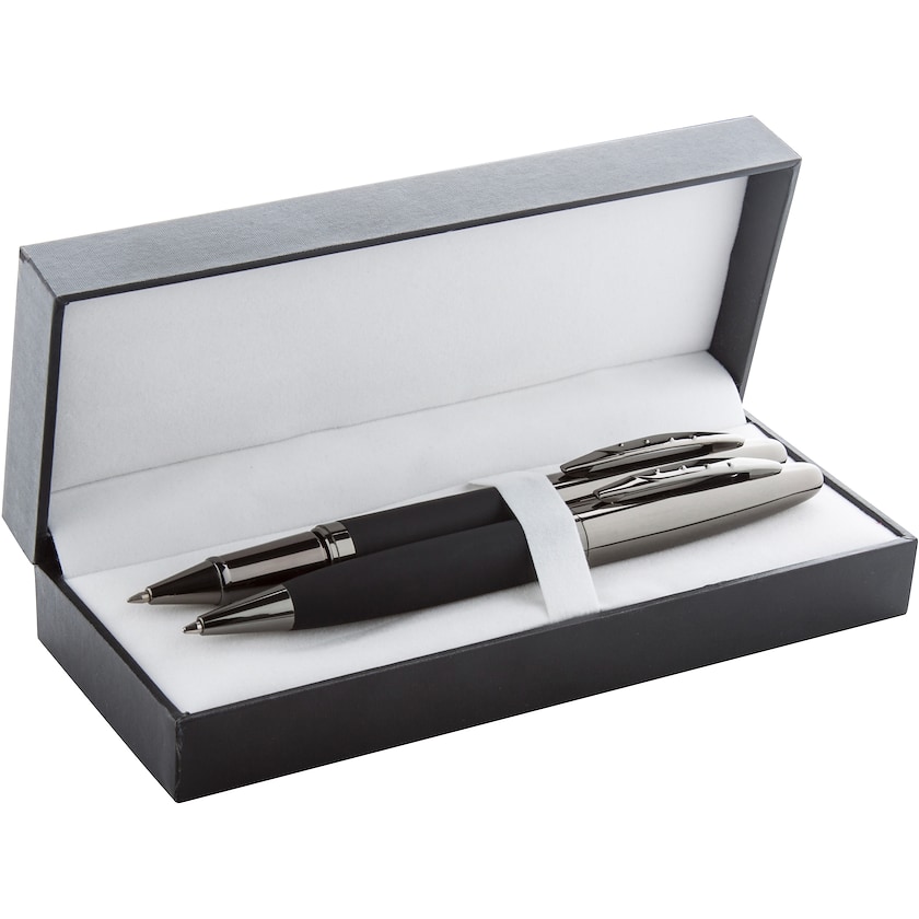 Modernes Stiftset mit Tintenstift und Kugelschreiber. Ein Metallstift mit einem gummierten Griff und ein Metalläußerem in Rotgussfarbe. Die Stifte haben blaue Tinte. Das Logo wird aufgedruckt oder gelasert. Der Preis ist für das Logoaufbringen auf einem Stift.
