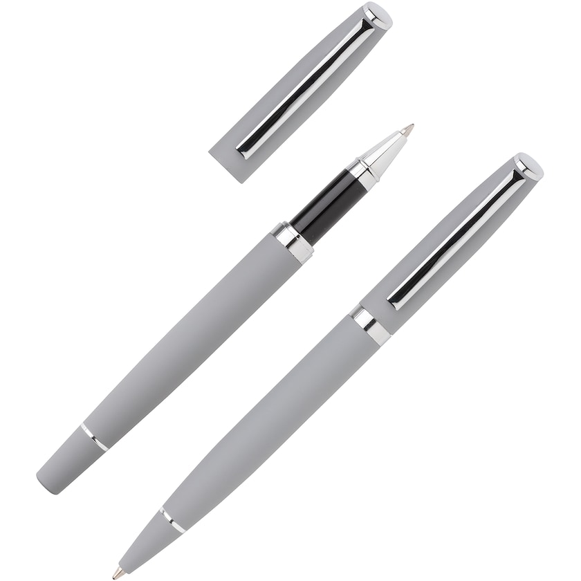 Elegantes Schreibset mit matter Oberfläche. Das Set besteht aus einem Kugelschreiber und einem Füller, die dank der matten Oberfläche gut in der Hand liegen.