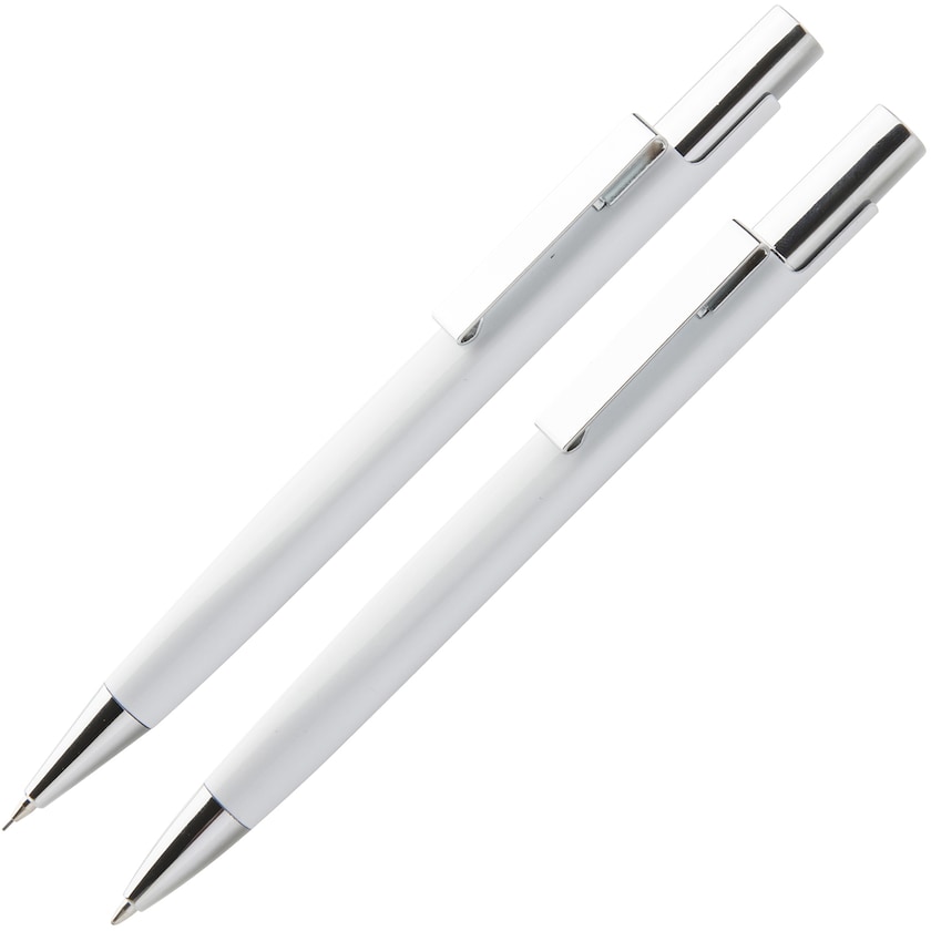 Schreib-Set bestehend aus Kugelschreiber und Bleistift mit dazugehöriger Geschenkebox. Beide Stifte sind aus Aliminium gefertigt. Kugelschreiber besitzt eine schwarze Tintenfüllung und der Bleistift hat eine Minenstärke von 0,7 mm. Der Logodruck kann als 1-Farbdruck oder Laserdruck angefertigt werden. Der Druckpreis betrift den Logodruck auf einen der beiden Stifte.