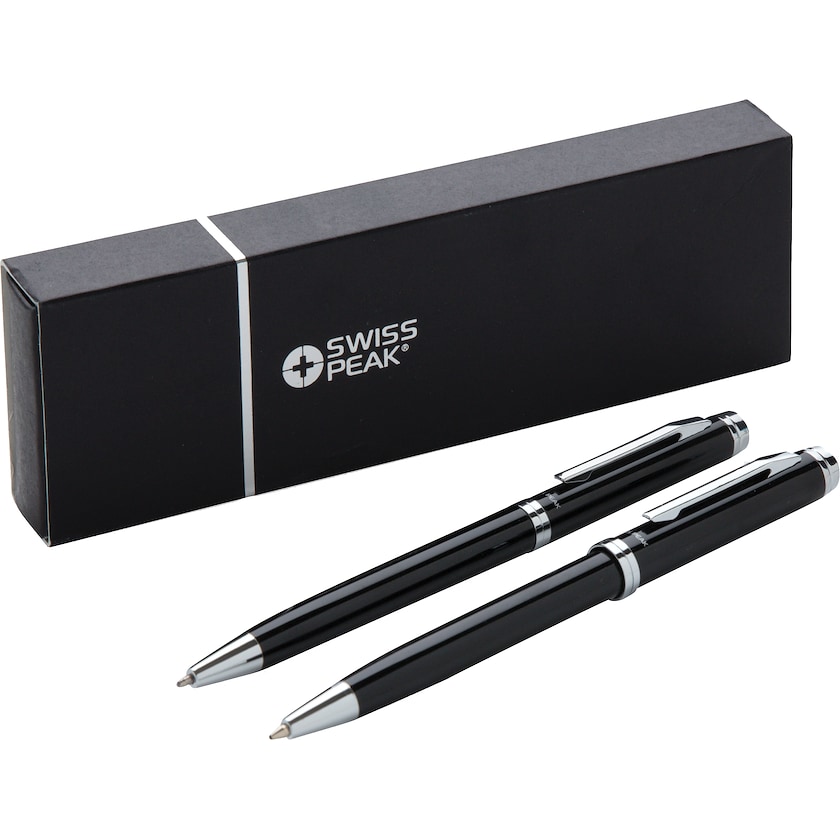 Set mit zwei Metalltintenstiften von Swiss Peak. Das Stifte-Set enthält einen Kugelschreiber mit blauer Tinte und einen Druckbleistift mit 0,7-mm-Mine. Der Tintenschreiber hat eine deutsche Tintenpatrone, die 1200 mm schreibt. Der Markierungspreis bezieht sich auf den Druck oder die Lasergravur auf einem der Stifte.