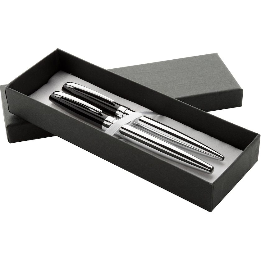 Schönes Schreibset mit Kugelschreiber und Füller. Die Stifte verfügen über verchromte Details und blaue Tinte. Die Lieferung erfolgt in einer schwarzen Geschenkbox.