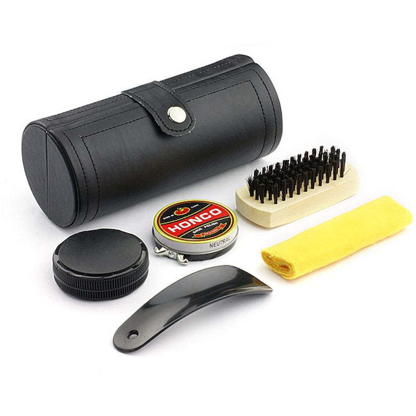 Das Schuhputzset enthält Schuhcreme, Schuhlöffel, Bürste und Putztuch. Markierung mit Gravur auf der Hülle.