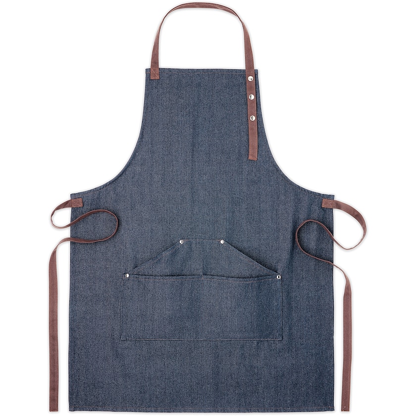 Schürze aus Jeansstoff mit braunen Baumwollriemen. Der Denim-Stoff verleiht der Schürze einen coolen Look. Vorne befinden sich drei Taschen. Jede Schürze kommt einzeln verpackt in einer Presentbox.