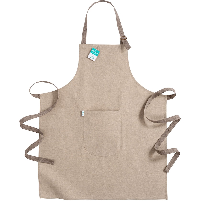 Lange Schürze aus recycelter Baumwolle. Auf der Vordertasche befindet sich ein Etikett, das zeigt, dass die Schürze aus recycelter Baumwolle besteht.