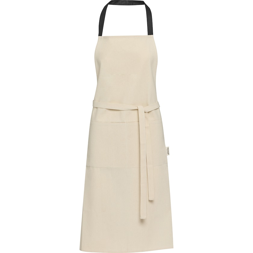 Schürze aus GRS-zertifizierter recycelter Baumwolle. Am Bauch befindet sich eine praktische Doppeltasche.