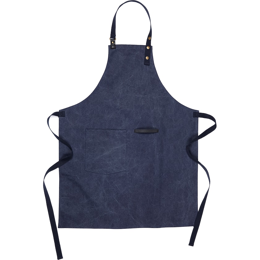 Exklusive Schürze aus recyceltem Baumwoll-Canvas. Der Stoff besteht zu 87% aus recyceltem Material. Auf der Vorderseite befindet sich eine Tasche sowie eine Schlaufe zum Aufhängen von Utensilien oder Küchentüchern. Die Schürze hat einen weichen und verstellbaren Nackenriemen.