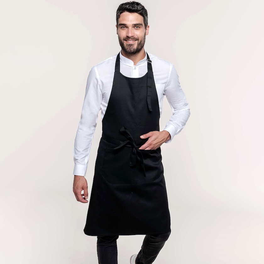 Profischürze, die auch industriell gereinigt werden kann. Die Schürze kann in einer gewöhnlichen Waschmaschine bei bis zu 60° gewaschen werden und verträgt Industriereinigungen bis 85 % im Einklang mit ISO 15797. Vorne befindet sich eine große Tasche mit zwei Fächern. Die Schürze ist 90 cm lang und 76 cm breit.