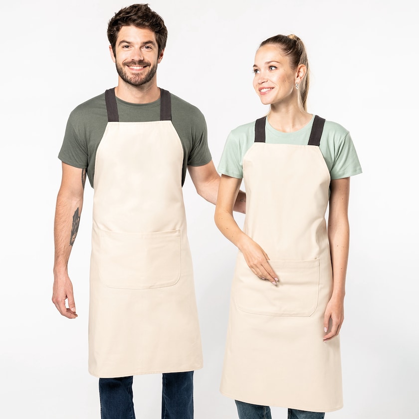 Schürze aus 100 % Bio-Baumwolle. Der Stoff wurde für ein verschliessenes Aussehen speziealbehandelt, weshalb die Farbe zwischen den einzelnen Exemplaren variieren kann. Vorne befindet sich eine große Tasche mit zwei Fächern. Die Schürze ist 90 cm lang und 76 cm breit
