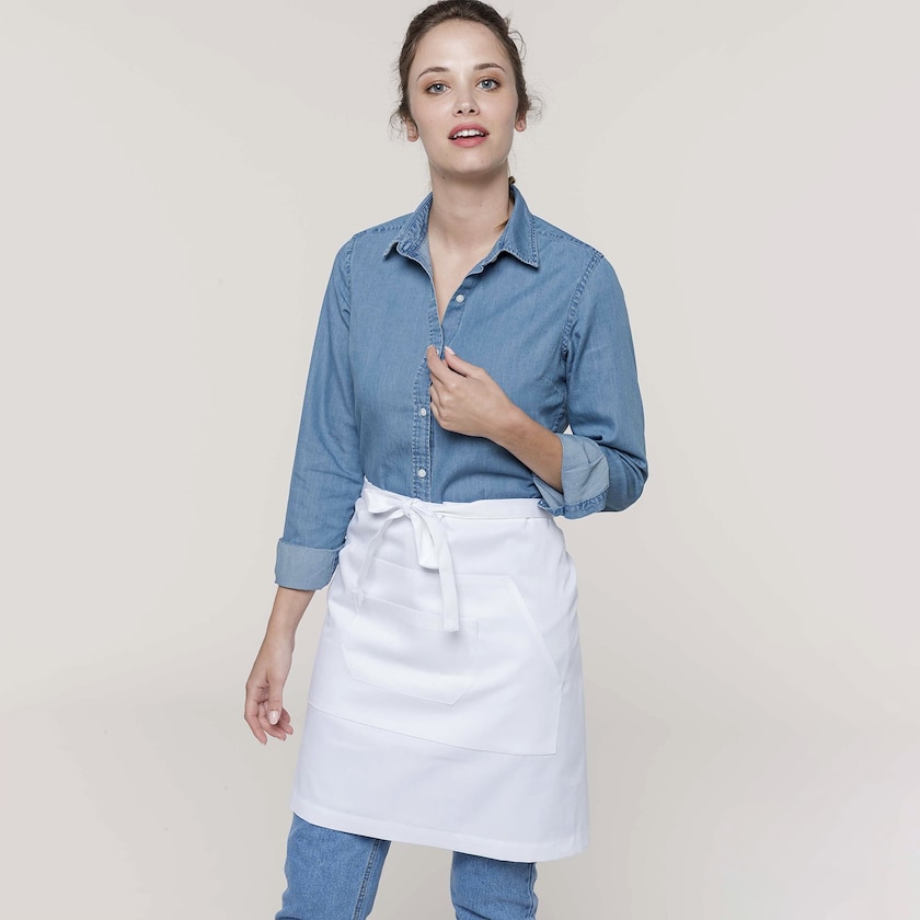 Schürze aus zuverlässiger Polyestermischung Vorne befindet sich eine große Tasche mit einer kleineren Tasche mit zwei Fächern. Die Schürze ist 50 cm lang und 90 cm breit.