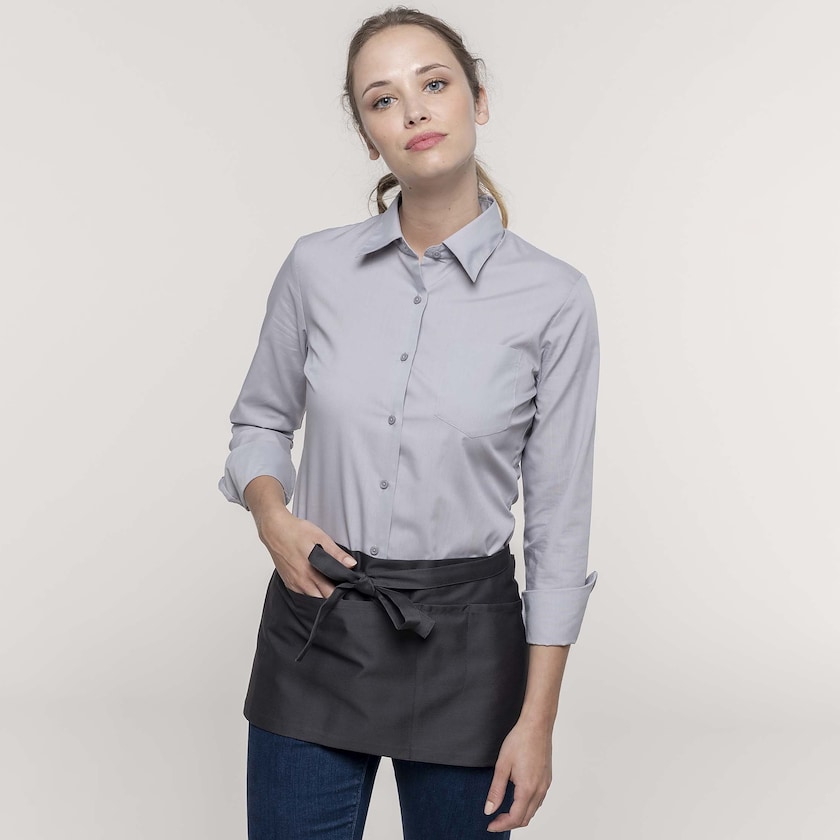 Kurzschürze in sehr vielen verschiedenen Farben. Schürze aus einer zuverlässigen Polyetsermischung. Die Schürze hat vorne eine große Tasche und kleinere an den Seiten. Die Schürze ist 62,5 cm lang und 90 cm breit.