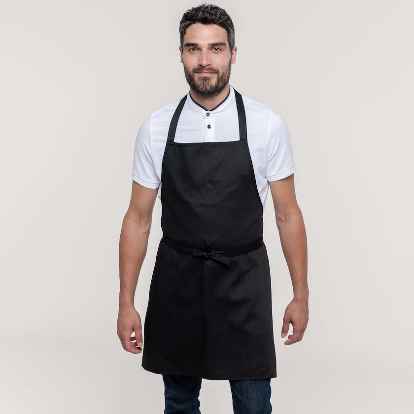 Klassische Latzschürze ohne Tasche. Latzschürze aus einem zuverlässiges Stoff aus Polyester und Baumwolle. Die Schürze ist 77 cm lang und 66 cm breit