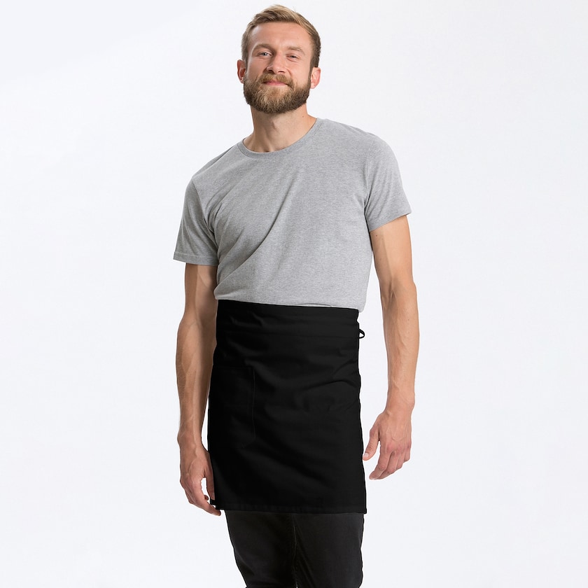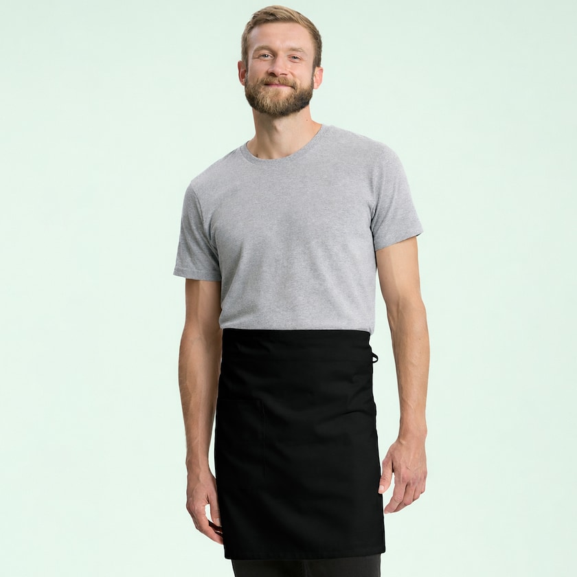 Kurze Schürze aus Fairtrade-zertifizierte Bio-Baumwolle. Fairtrade, EU Ecolabel, SA8000 und Oeko-tex-zertifiziert. Die Schürze hat eine Tasche. Die Schürze ist mit Etiketten versehen, auf denen steht, dass sie von Neutral kommt und die Fairtrade-Anforderungen erfüllt.
