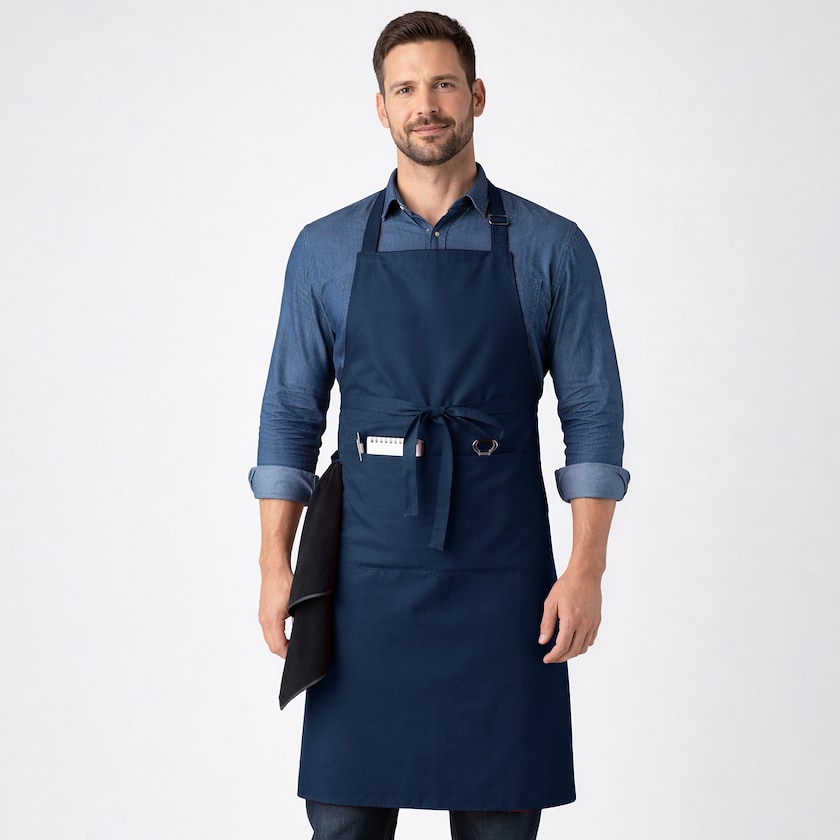 Preiswerte Schürze mit zwei Taschen. Die Schürze ist aus 80% Polyester und 20% Baumwolle, was einen zuverlässigen Stoff ergibt, der häufig gewaschen werden kann.