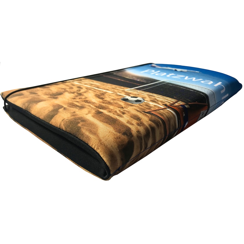 Sitzunterlage mit 4-Farb-Fotodruck. Die Sitzunterlage kann, wenn sie nicht benötigt wird, zusammengefaltet und mit einem Gummibad gehalten werden. Es eignet sich für innen und außen. Der Druckpreis bezieht sich auf Druck auf beiden Seiten des Kissens, dabei kann jede Seite unterschiedlich bedruckt werden.