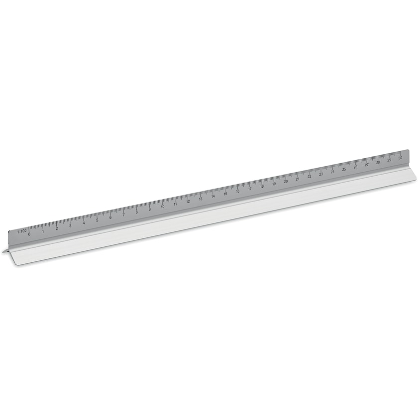 Maßstabslineal aus Aluminium mit Lasergravur. Das Lineal hat die folgenden Skalen: 1:20, 1:25, 1:50, 1:75, 1:100.