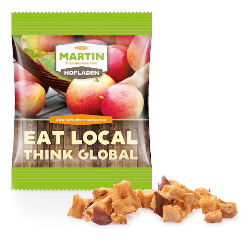 Kleine Tüte mit getrockneten Apfelstückchen. Eine gesunde und vegane Alternative. Die ganze Tüte wird nach Ihren Wünschen bedruckt.