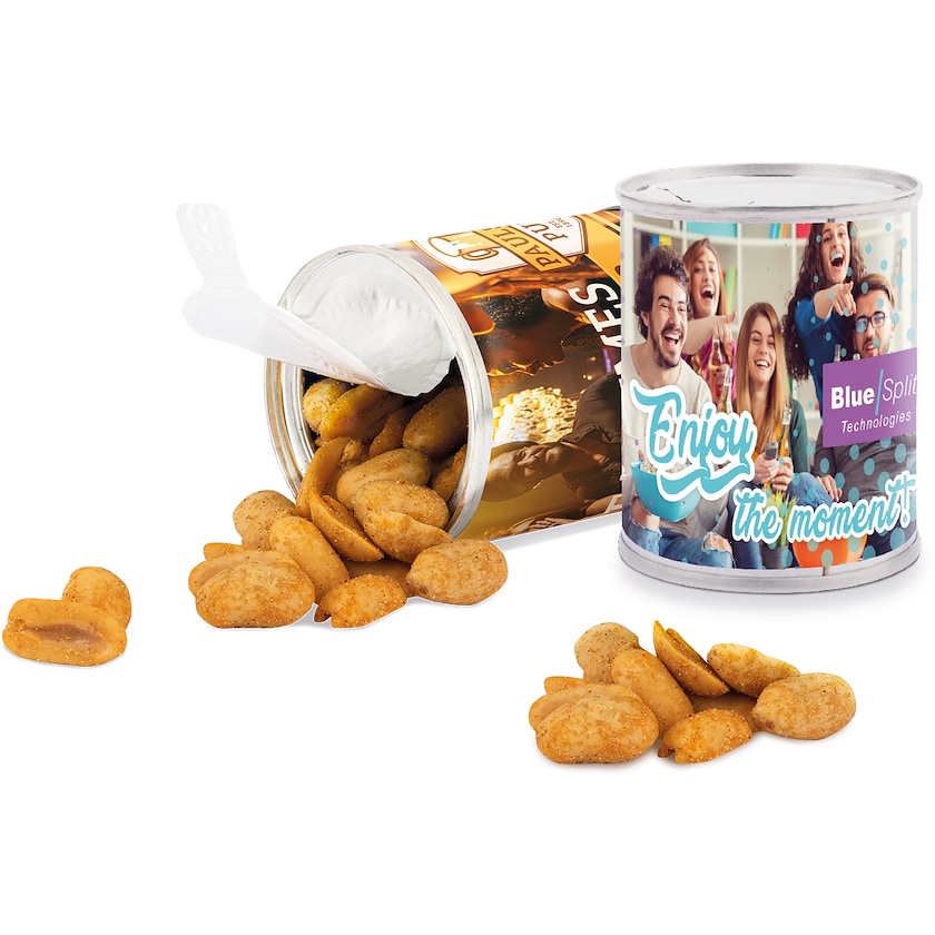Öffnen und genießen! Eine Dose voller leckerer Snacks. Wählen Sie zwischen Erdnuss- und Cashew+Erdnuss-Mix. Die komplette Außenseite der Dose wird nach Ihren Wünschen bedruckt.