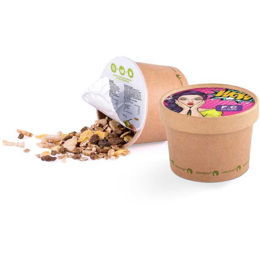 Pappbecher mit erklassigem Müsli von Hahne. Die Milch wird direkt in den Becher gefüllt. Eine gesunde und nährstoffreiche Zwischenmahlzeit für Unterwegs. Wählen Sie zwischen Schoko-Müsli mit 12,5 % Schokolade oder Fruchtmüsli mit 30 % Frucht. Der Druck erfolgt auf einer Pappscheibe oben auf dem Becher.