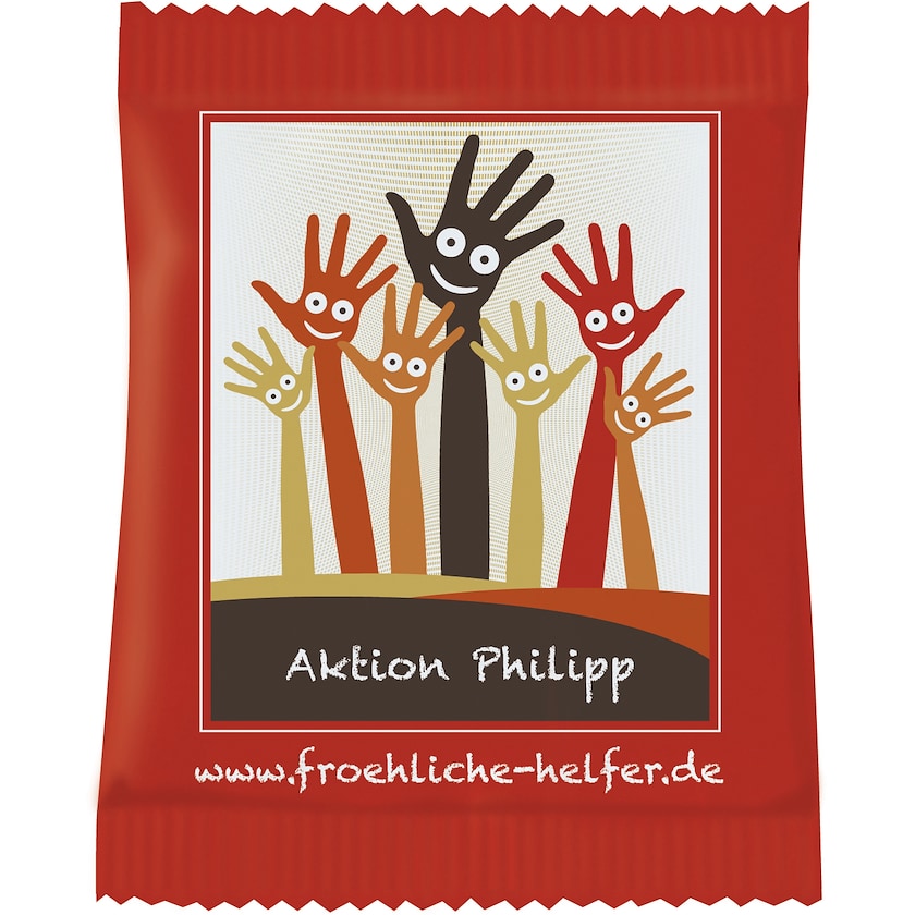 Eine Tüte mit Snacks in unterschiedlichen Formen. Die Snacks sind unter anderem als Mond, Sterne, Herzen oder Figuren geformt. Die Tüte ist entweder in Aluminium oder als transparente Folie erhältlich. Der Druck auf der Tüte erfolgt ganz nach Ihren Wünschen. Der richtige Snack Mix für die nächste Party!