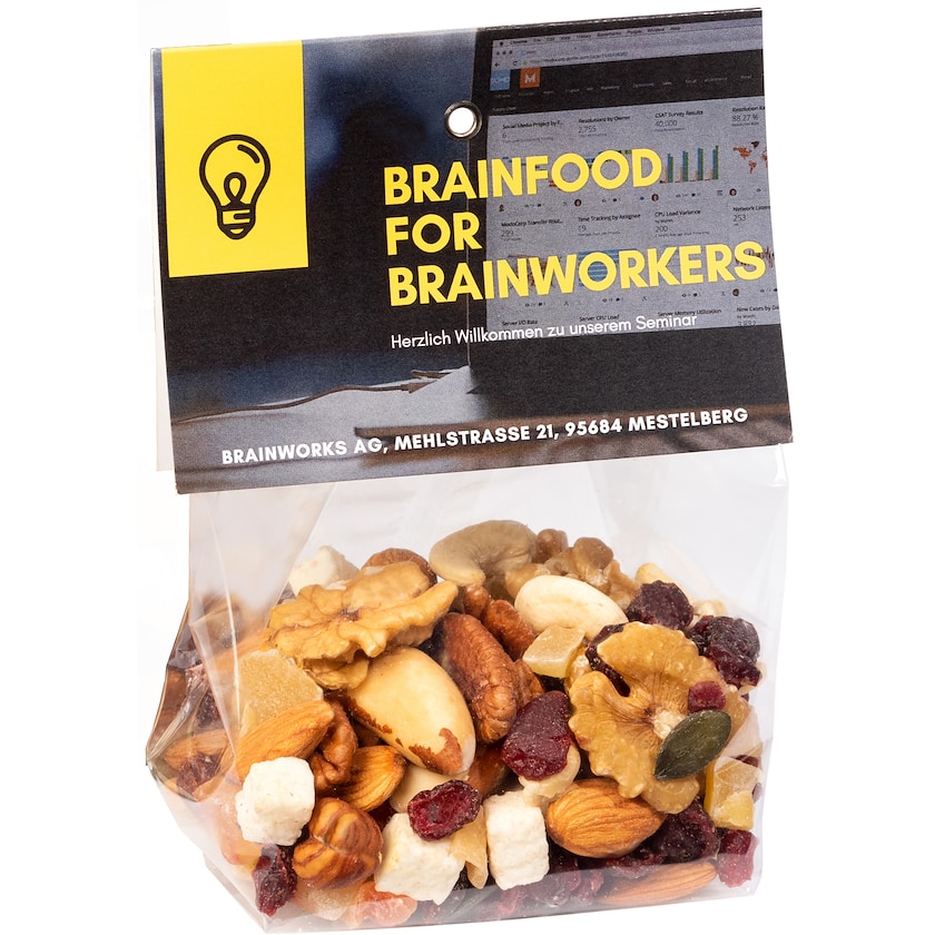 Nuss- und Fruchtmix in einer Verpackung mit einem Pappetikett mit Ihrem Aufdruck. Enthält unter anderem getrocknete Cranberries, Papaya, Ananas, Walnüsse und Kokosnuss.