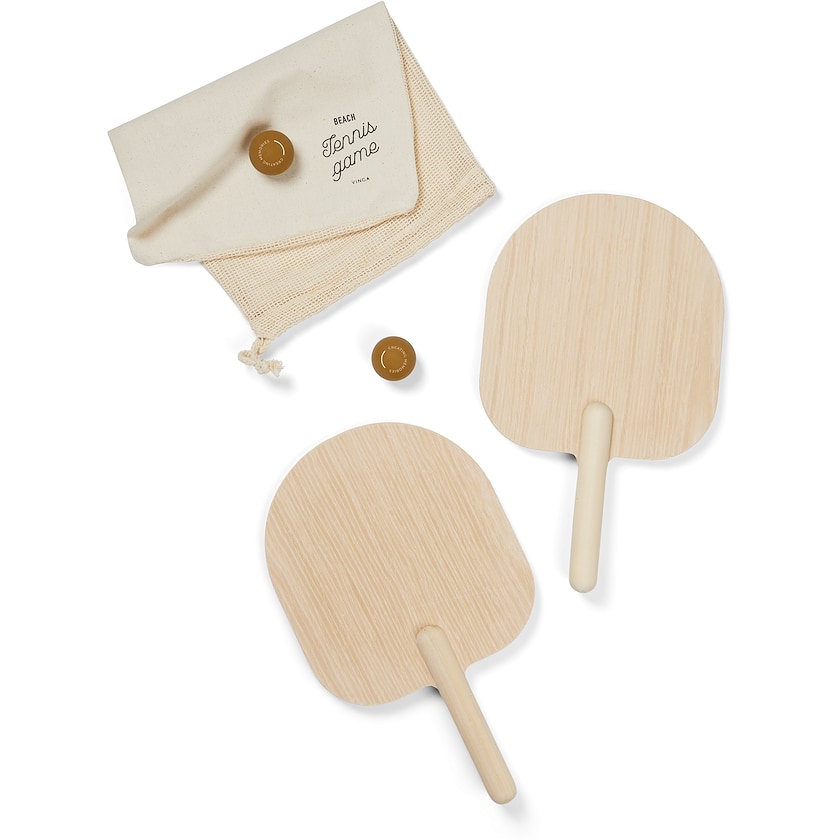 Beach-Tennis-Set aus Holz von Vinga. Lustige Unterhaltung am Strand, im Park oder zu Hause im Garten. Das Set beinhaltet zwei Schläger, zwei Gummibälle und eine Aufbewahrungstasche aus Baumwolle. Jeder Schläger misst 350 x 210 mm und besteht aus FSC-zertifiziertem Sperrholz.
