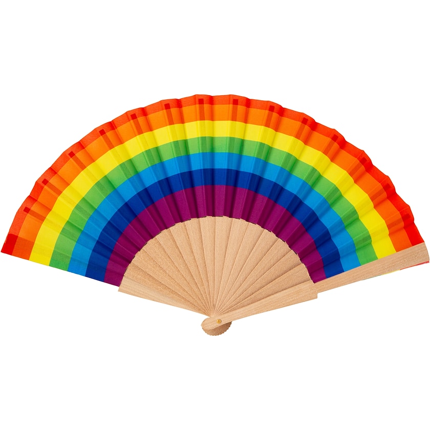 Fächer aus regenbogenfarbenem Stoff. Hergestellt aus Polyester und Holz.