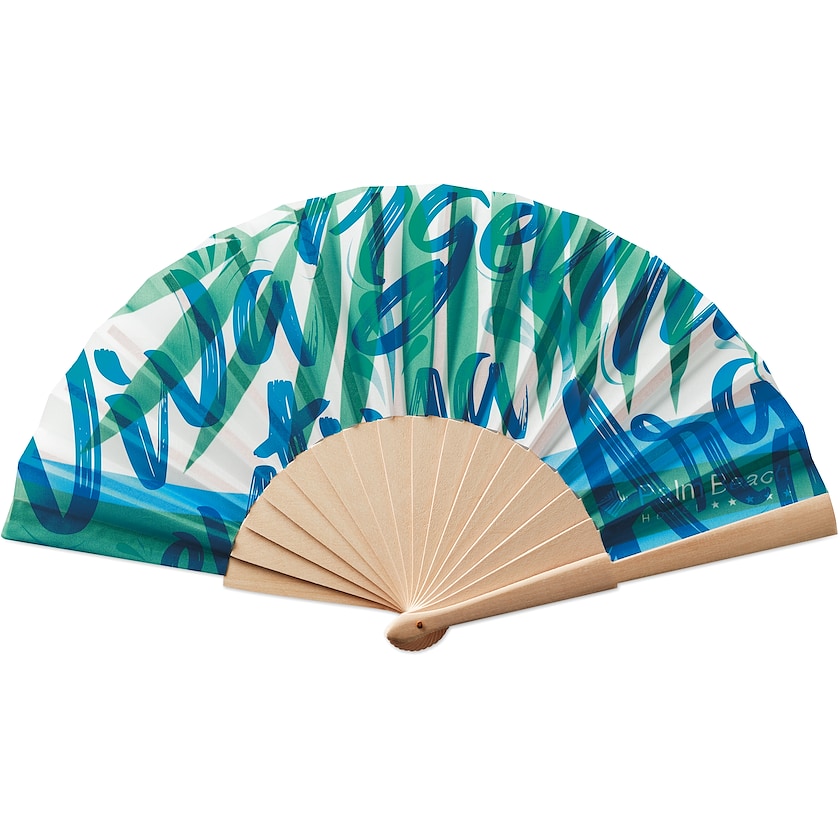 Fächer aus Holz, der individuell bedruckt werden kann. Eine Seite des Stoffes lässt sich bedrucken, die Rückseite ist weiß. Der Fächer hat 14 Rippen und zwei Endstücke. Da der Fächer auf Bestellung gefertigt wird, ist die Lieferzeit länger als üblich.