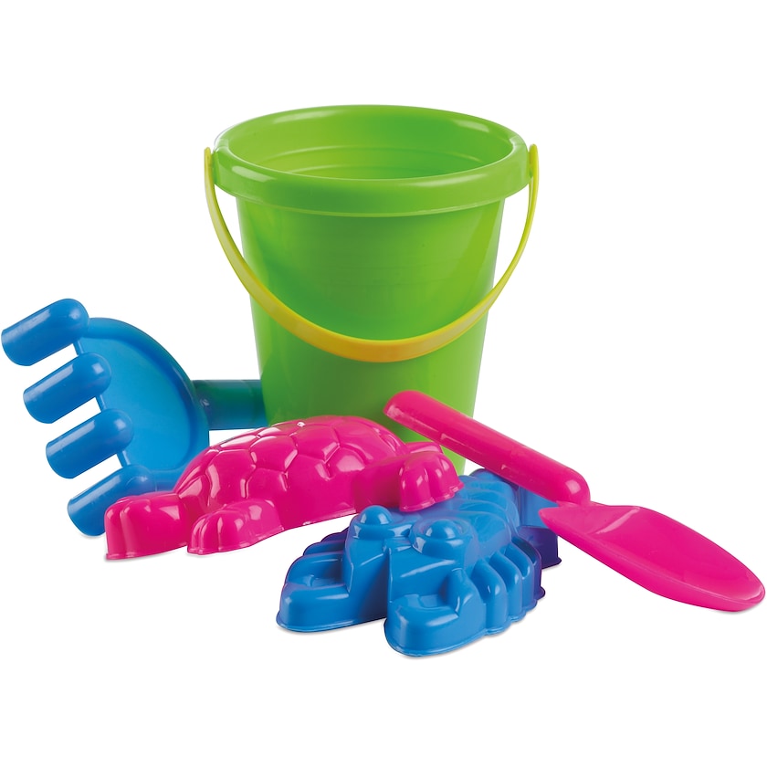 Buntes Set mit Strandspielzeug. Das Set enthält einen Eimer, eine Schaufel, einen Kratzer und zwei Förmchen. Kinderliebling für den Strand!