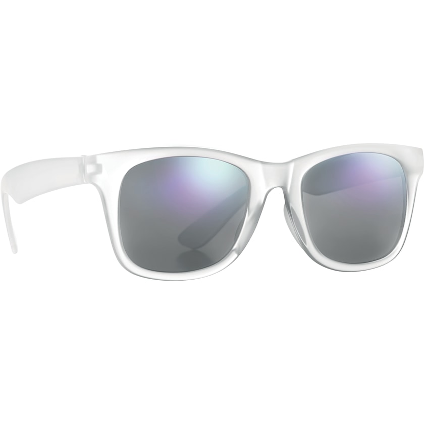 Sonnenbrille mit Spiegelglas. Ibiza ist transparent, hat Bügel in passender Farbe und einen UV400-Schutz. Kann in max. 2 Farben bedruckt werden.
