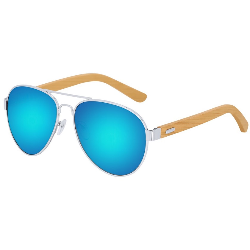 Pilotensonnenbrille mit verspiegelten Gläsern. Die Gläser verfügen über UV400-Schutz. Die Bügel sind aus Bambus gefertigt. Lieferung im Mikrofaserbeutel.