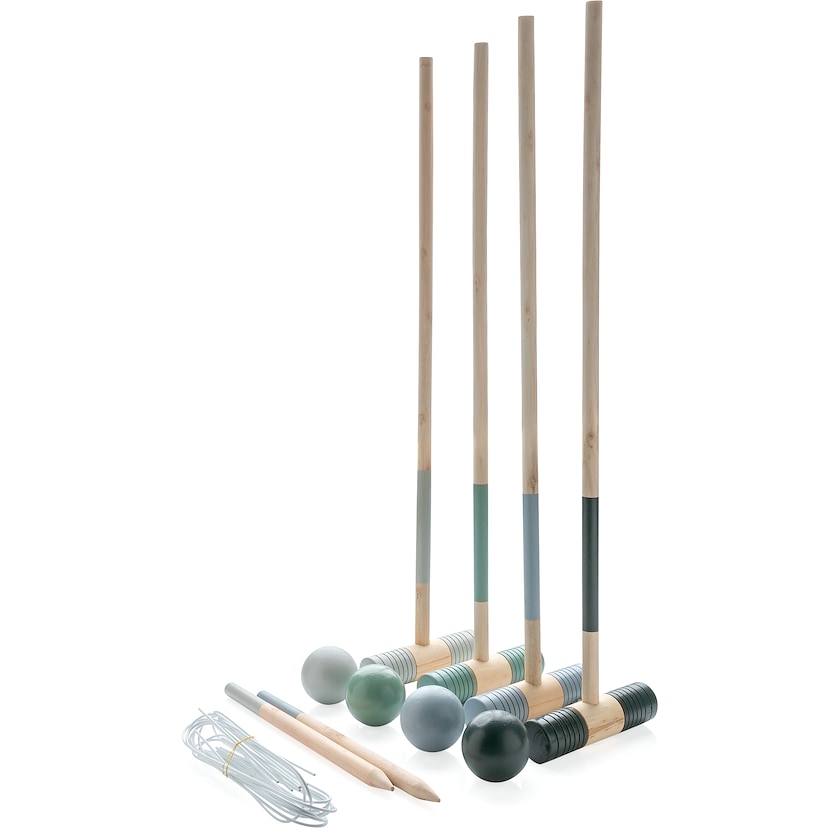 Schön gestaltetes Krocketspiel. Das Set enthält 4 Krocketschläger, 4 Krocketbälle, 2 Zielmarkierungsstäbe und 10 Metallbögen. Inklusive Aufbewahrungstasche aus Baumwolle und Anleitung. Der Druck liegt auf dem Aufbewahrungsbeutel.