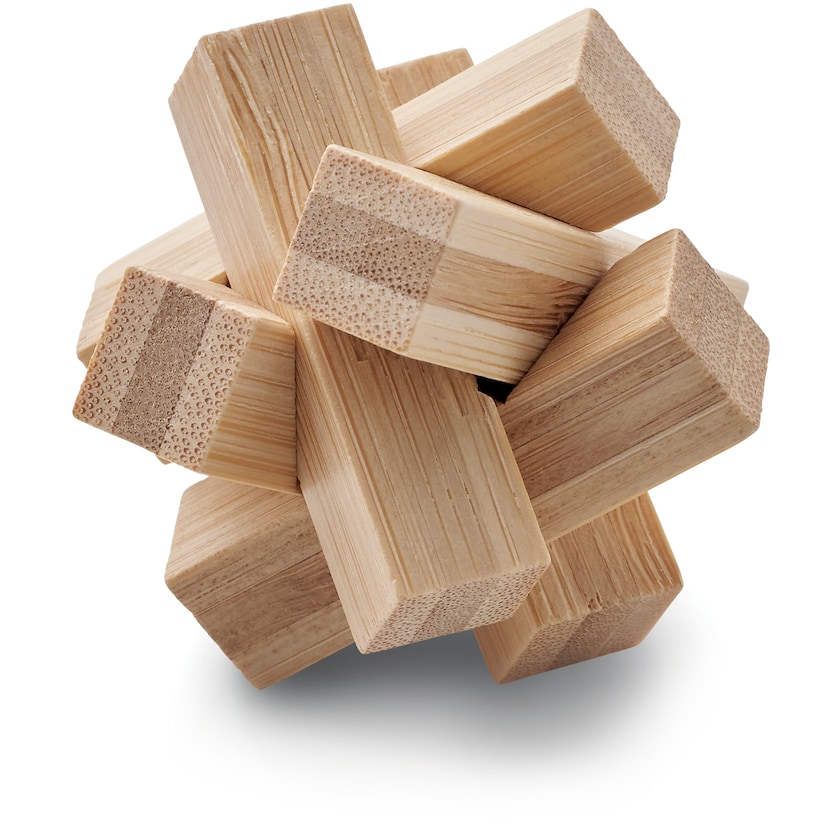 Sternförmige Gehirngymnastik aus Bambus. Die Lieferung erfolgt in einem Karton aus Recyclingpapier. Der Druck erfolgt auf dem Karton.