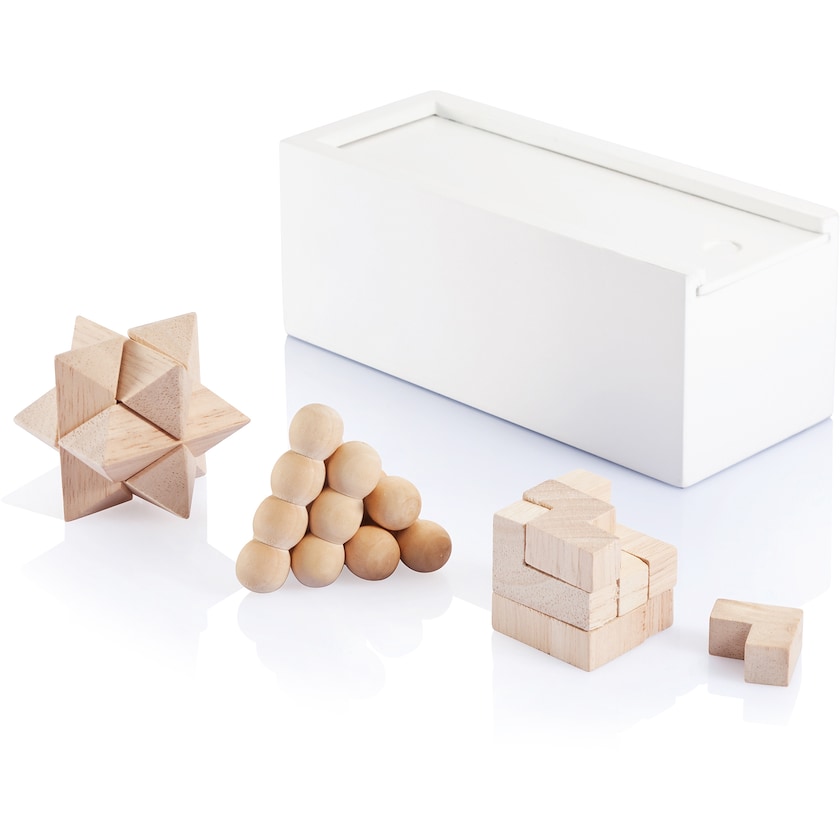 Hübsches Set mit drei 3D-Puzzeln die das Gehirn spielerisch fördern. Das Set und die Box sind aus Bambus gefertigt, der Druck erfolgt auf der Box. Alles wird in einem hübschen Geschenkkarton geliefert.
