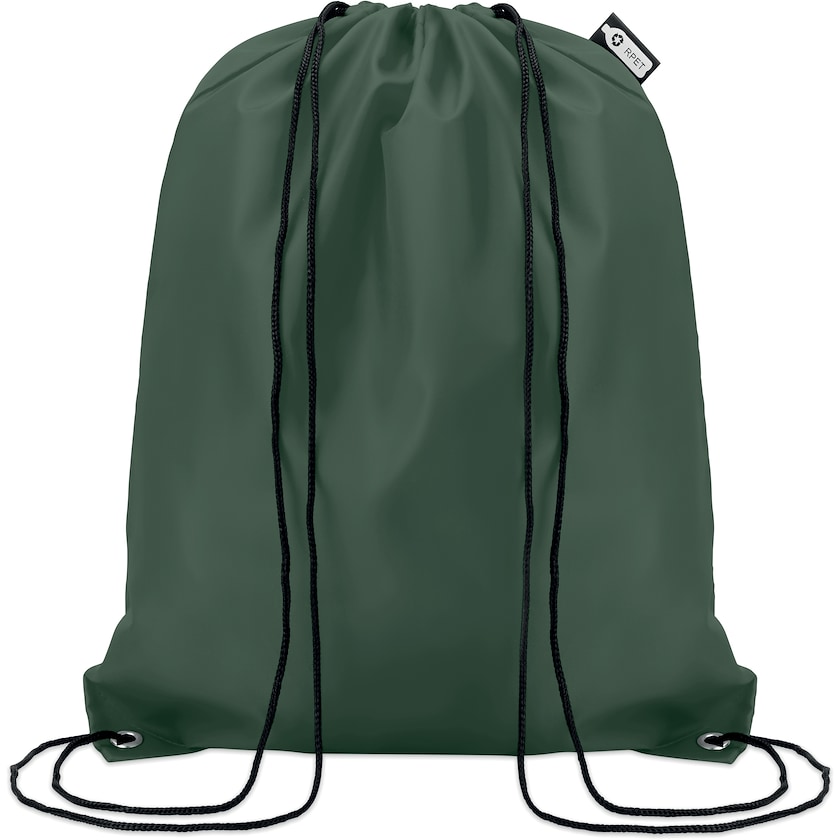 Umweltfreundlicher Turnbeutel aus RPET, sprich recycelten Plastikflaschen. Der Turnbeutel hat ein Etikett, das die Umweltfreundlichkeit und RPET als Material anzeigt. Eine Entscheidung für die Natur!