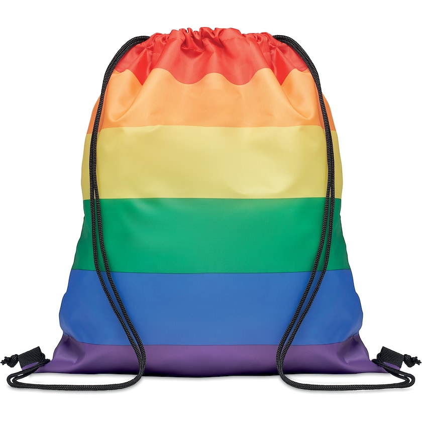 Regenbogenfarbener Turnbeutel mit eigenem Aufdruck. Molina besteht aus 210D rPET, einem umweltfreundlichen Material aus recycelten PET-Flaschen. Die Kordeln sind aus Polypropylen.