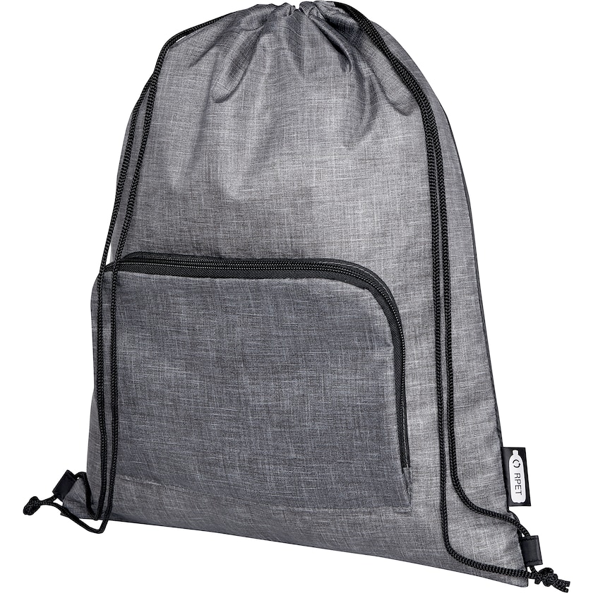 Umweltfreundlicher Turnbeutel, der sich leicht zusammenfalten lässt. Der Turnbeutel besteht aus recyceltem Polyester. An der Vorderseite befindet sich eine Tasche, die auch als Aufbewahrungstasche für den Turnbeutel fungiert, wenn dieser nicht genutzt wird.