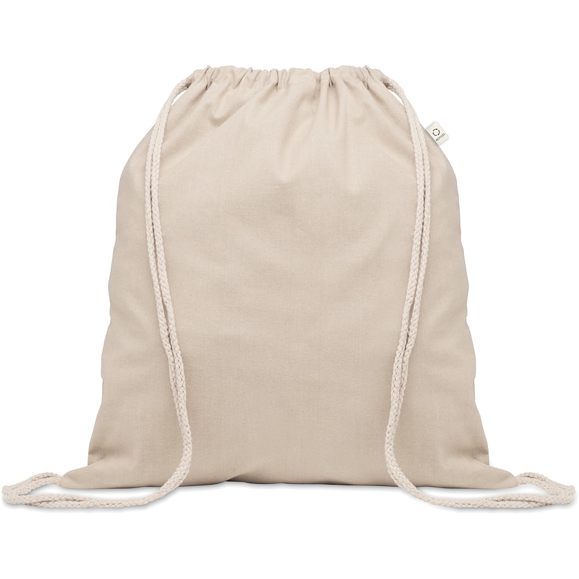 Naturfarbener Turnbeutel aus recycelter Pre-Consumer-Baumwolle und rPET. Ein hochwertiger Turnbeutel, der gut für das Klima ist.