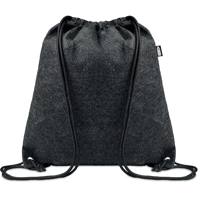 Umweltfreundlicher Turnbeutel aus Filzstoff. Das Filzmaterial besteht aus rPET (recycelten PET-Flaschen) und die Kordeln aus Polyester. Seitlich befindet sich ein Etikett, das auf das Material aus rPET hinweist.