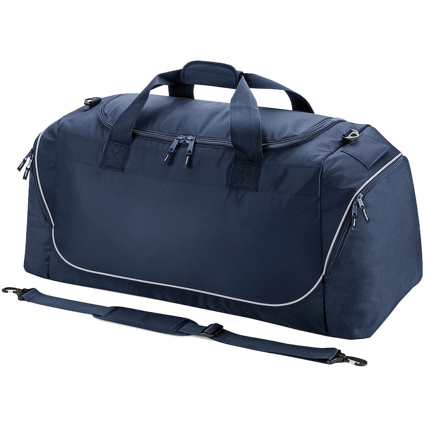 Große Sporttasche mit 110 Liter Volumen. Die Tasche hat eine robuste Konstruktion mit Bodenplatte für einen besseren Halt. Auf der Unterseite befinden sich Füße, die das Rutschen der Tasche mindern. Auf den beiden kurzen Seiten gibt es große Reißverschlussfächer.