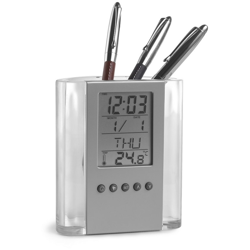 Moderner Stifthalter mit Multifunktionsuhr. Die Uhr hat viele Funktionen: Alarm, Datum sowie Temperatur. Bestellen Sie Stifthalter mit Uhr zum Bedrucken!