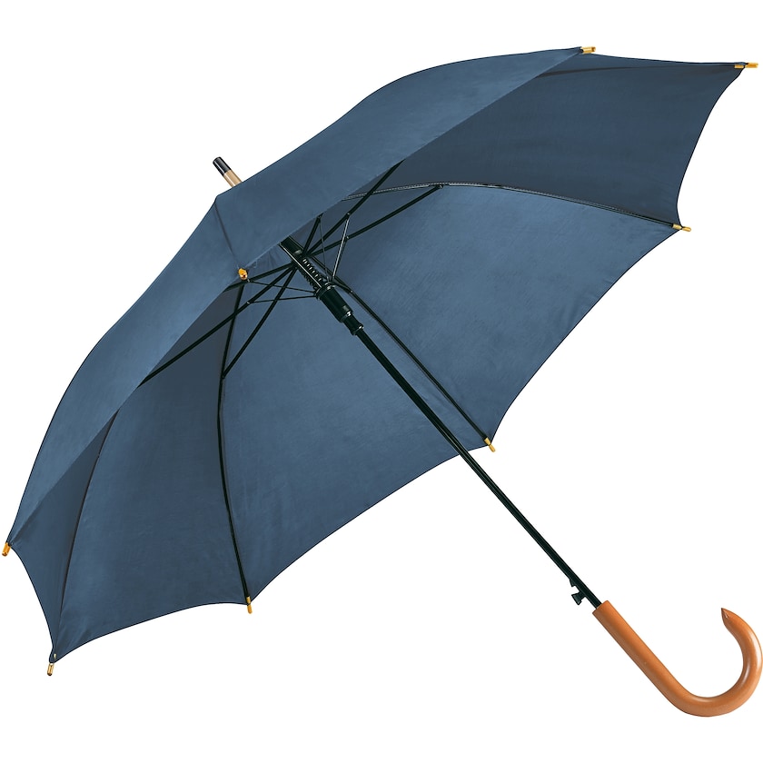 Automatikschirm mit Holzgriff. Schaft und Rippen sind aus Metall. Ein hochwertiger Regenschirm, der in vielen Farben erhältlich ist.