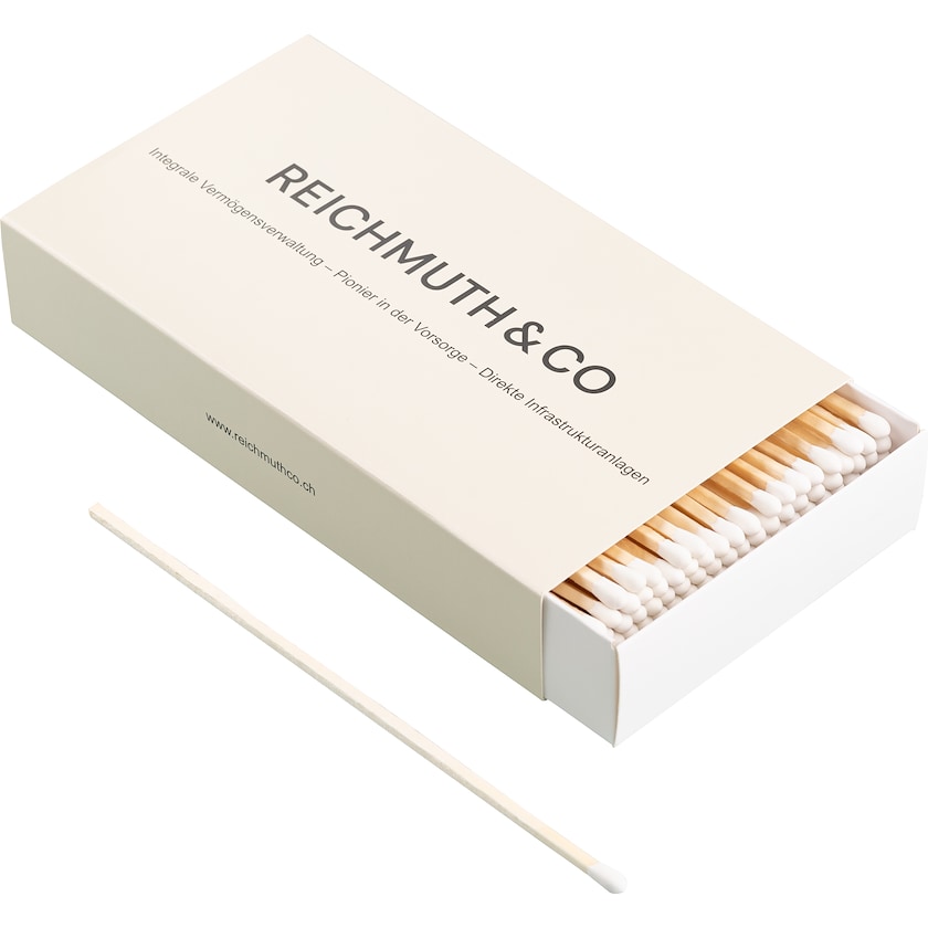Große Streichholzschachtel mit insgesamt 160 langen Streichhölzern. Die Streichhölzer haben eine Länge von 185 mm. Der Druck erfolgt in bis zu vier Farben nach der Pantone-Skala und kann zusätzlich im CMYK-Farbmodus ausgeführt werden. Sie haben die Wahl zwischen 16 verschiedenen Kopf- und 7 unterschiedlichen Holzfarben.